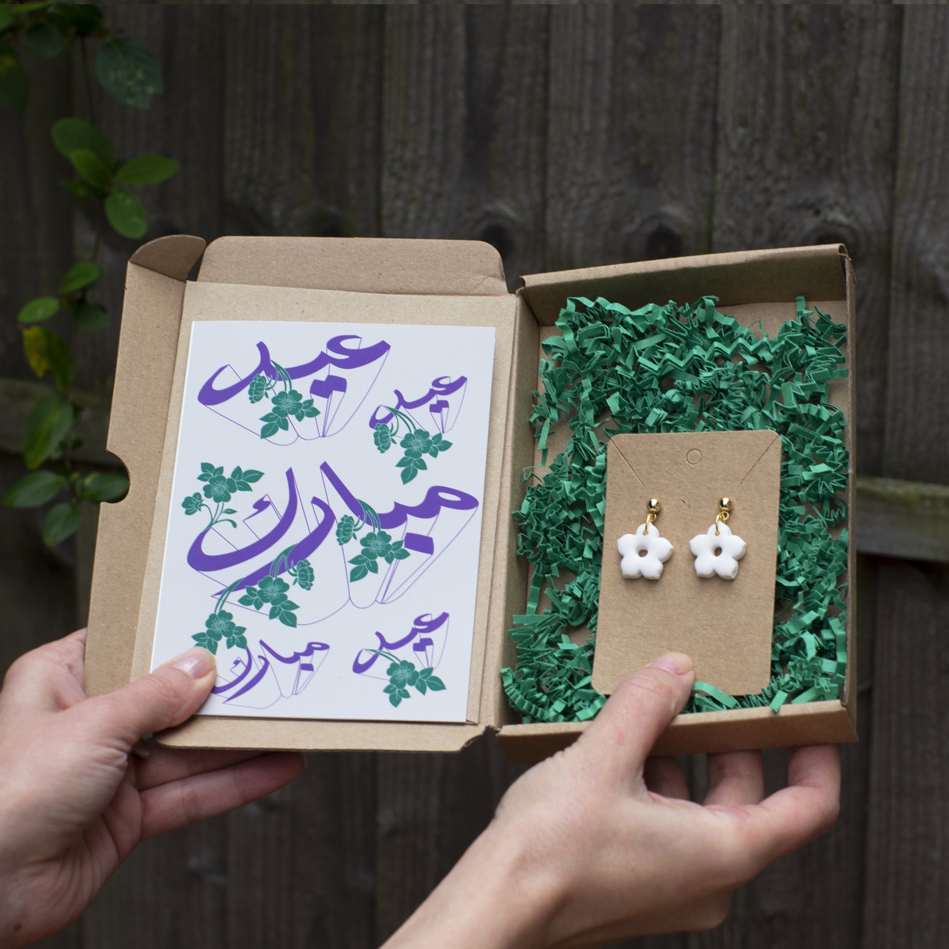 This personalised Nowruz gift box includes beautiful white flower earrings and a cool floral Nowruz greeting card with 'Happy Nowruz' written in Persian calligraphy.