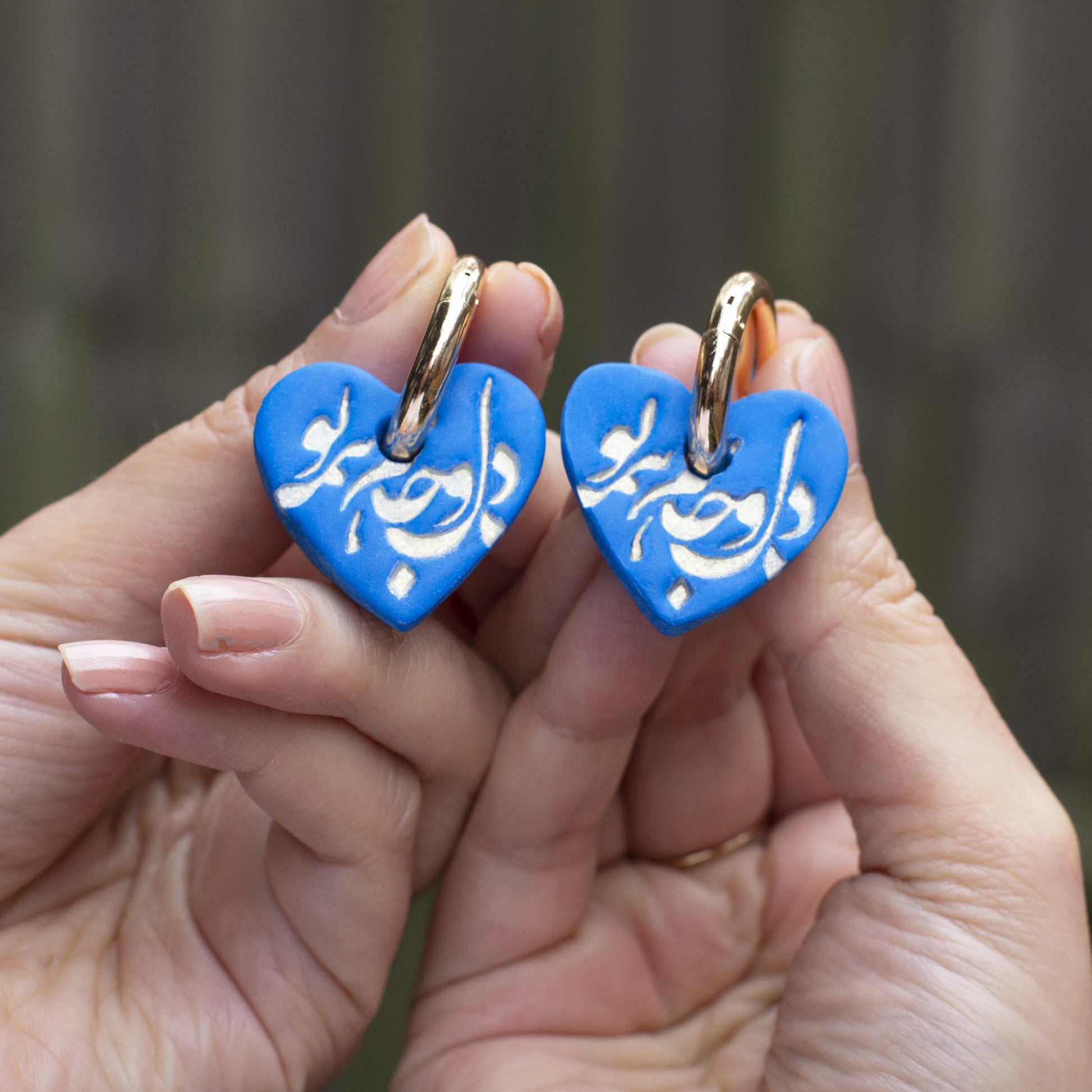 Persian Calligraphy Blue Heart Hoop Earrings _ دل و جانم همه تو