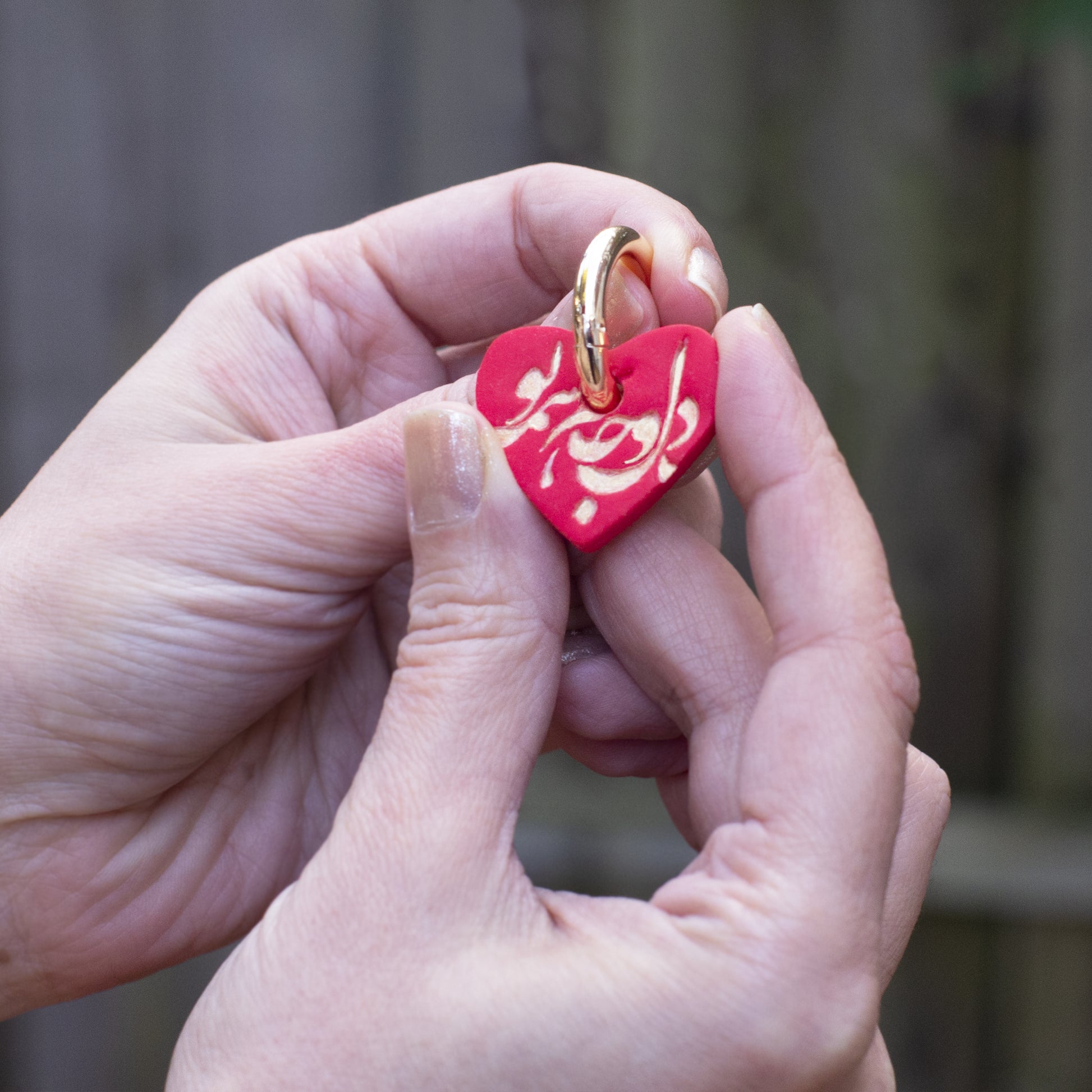 These Persian Calligraphy Heart Hoop Earrings are a celebration of love and poetry, inspired by the timeless words of Rumi.The 18k gold-plated brass hoop measuring 24.5mm, beautifully frames a heart crafted from polymer clay, adorned with beautiful Nastaliq Persian calligraphy. The calligraphy is filled with a pearl pigment, giving it a unique, elegant finish that stands out with every glance.