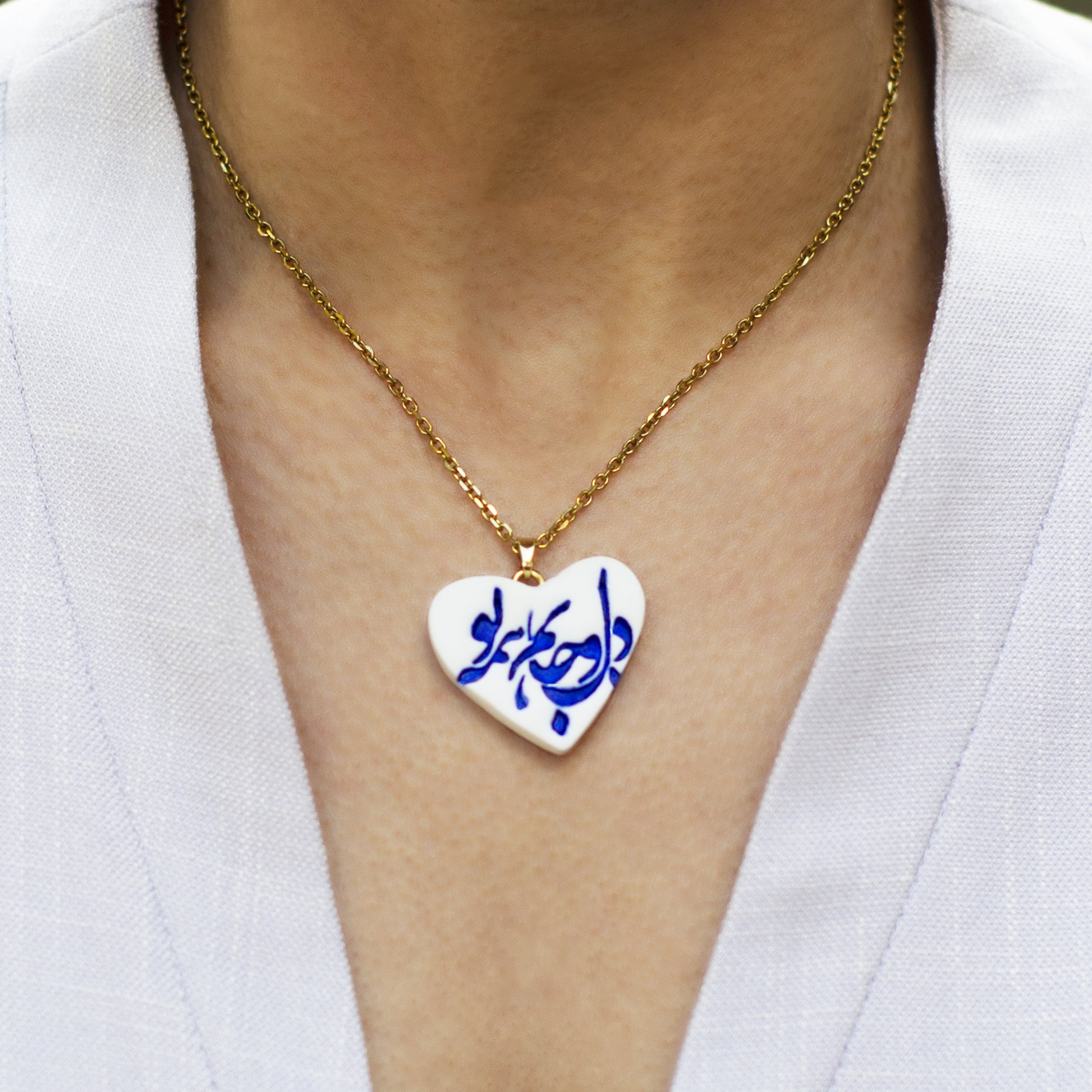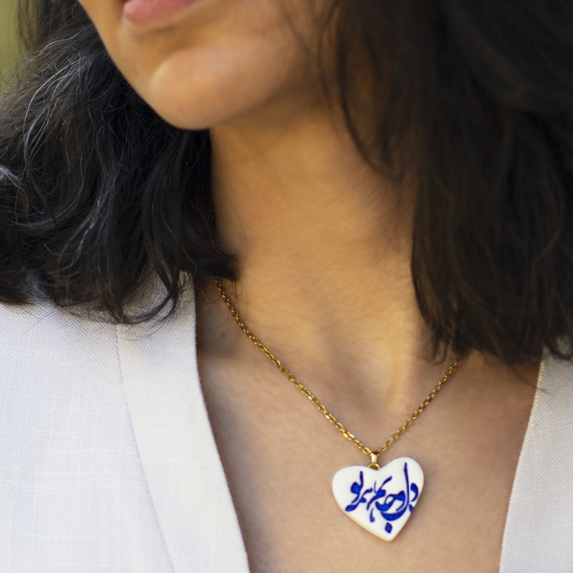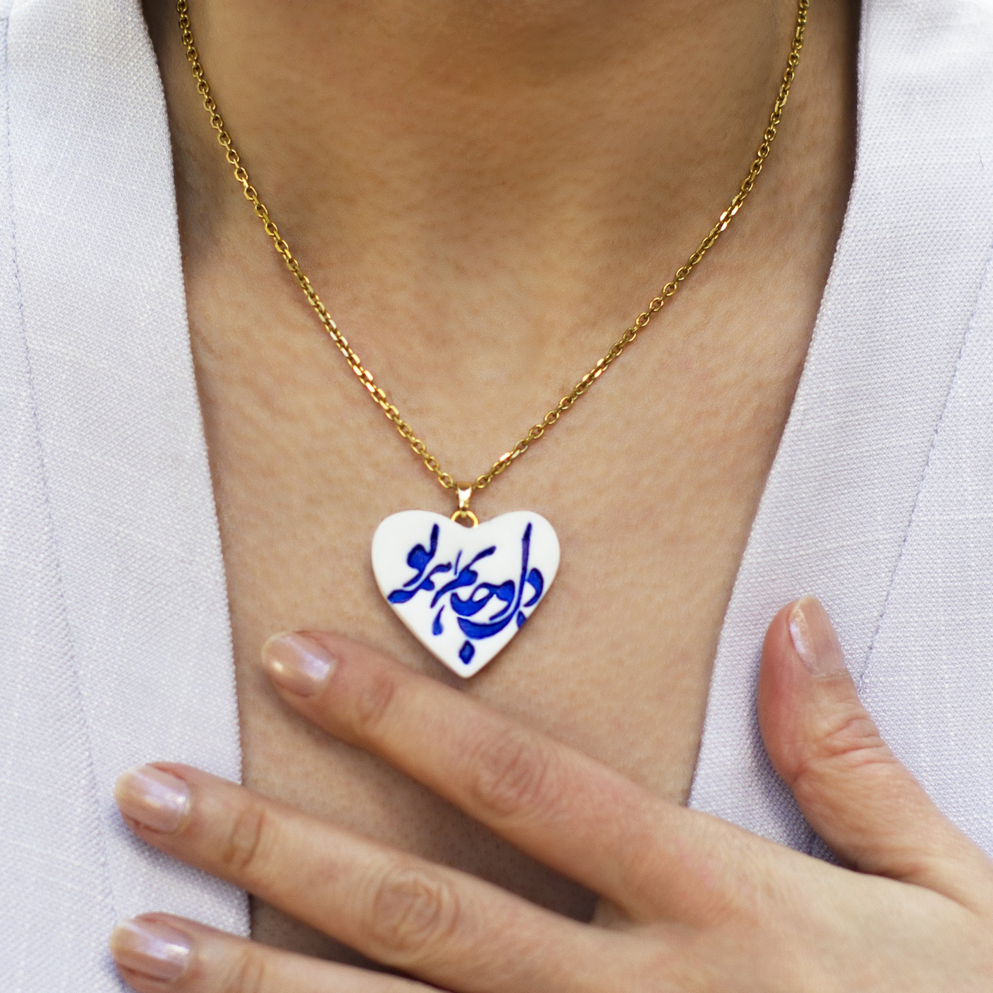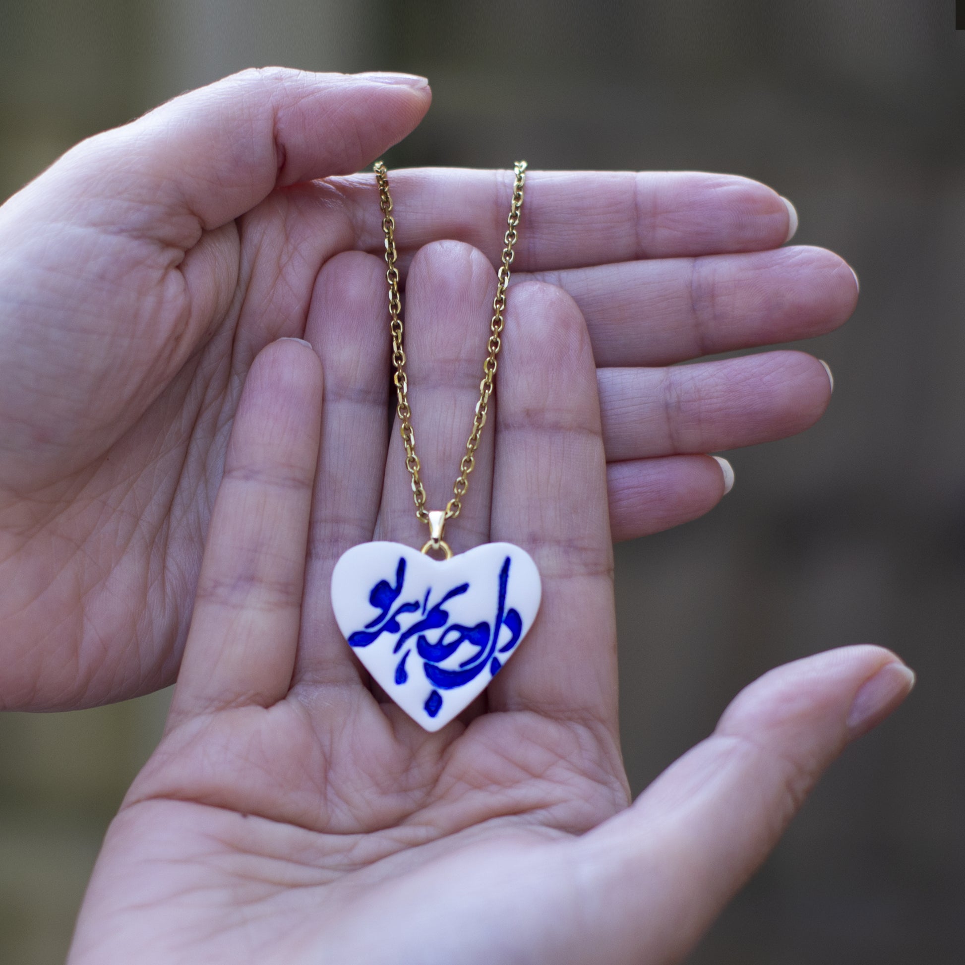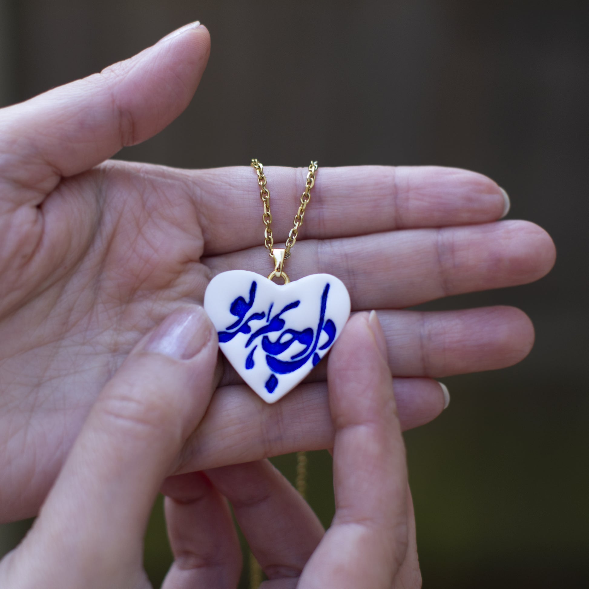 This Persian Calligraphy Heart Necklace is inspired by the words of a Rumi poem. The delicate heart pendant is handmade from polymer clay and features Nastaliq Persian calligraphy in classic white and Persian blue.