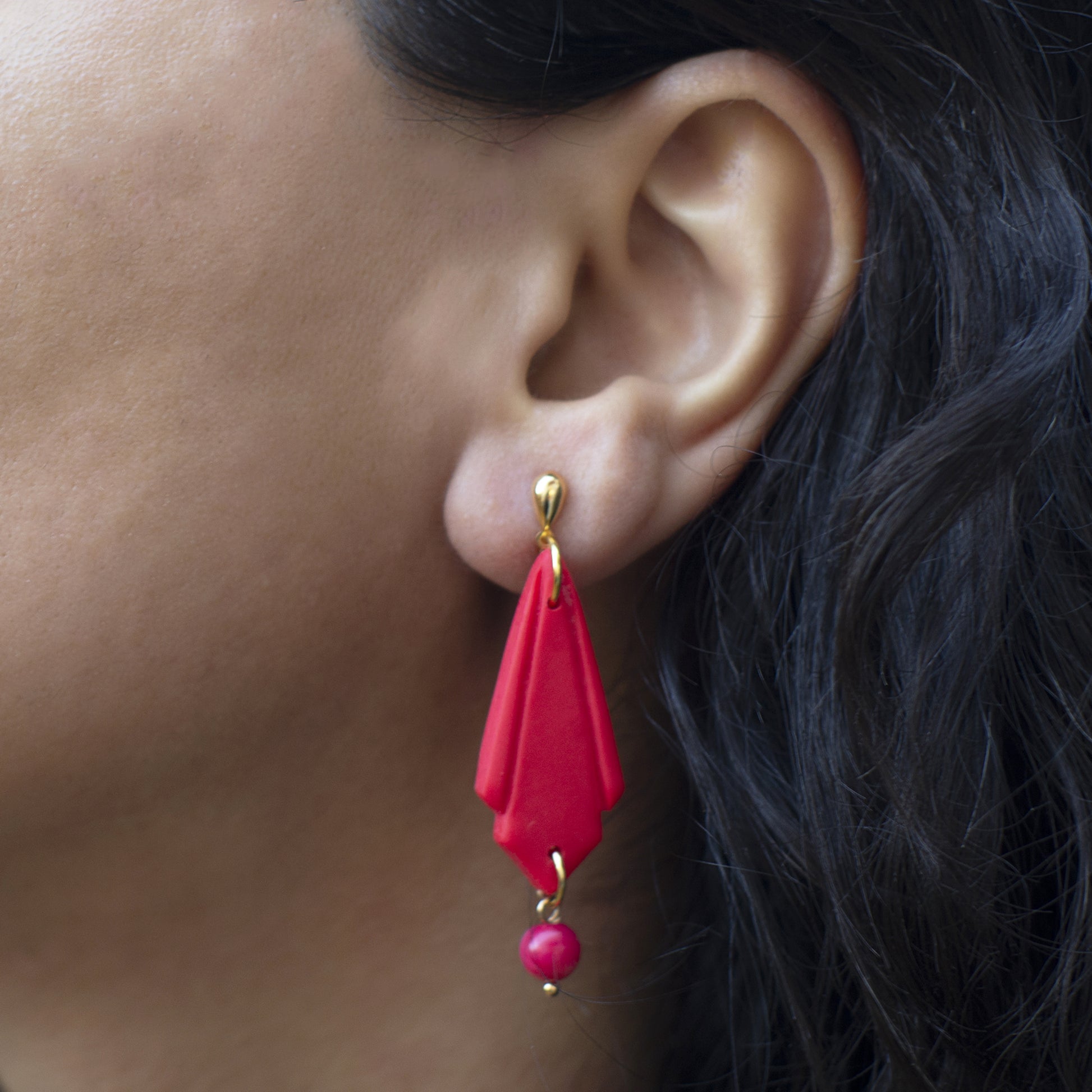 Persian inspired red coral earrings, handmade in London. They're a cool mix of clay and gemstone with a contemporary and minimalist design inspired by Persian motifs. The materials include polymer clay, coral stone and 24k gold-plated jewellery findings. each piece tells a story of cultural fusion and individual style.